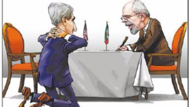 Polemiche per una vignetta comparsa su un giornale israeliano all'indomani dello stop alle sanzioni contro l'Iran. Nella caricatura pubblicata in prima pagina dal quotidiano Israel Hayom, molto vicino al premier Benyamin Netanyahu, si vede il segretario di Stato Usa, John Kerry, in ginocchio ai piedi del ministro degli Esteri iraniano, Javad Zarif, e con le mani dietro la testa come i marines Usa catturati di recente in Iran.