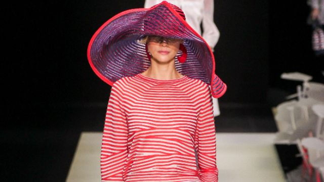 © web|Pulloverino a righe orizzontali abbinato a pantapalazzo a vita alta effetto stripe e a cappello bicolor con falda larga, Giorgio Armani