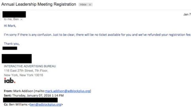 Adblock Plus, la società il cui software consente di bloccare gli annunci presenti sui siti web, non potrà partecipare allo Iab Leadership Summit in programma in California, negli Stati Uniti. Sono stati gli stessi organizzatori dell'evento sulla pubblicità online a rimbalzare, via mail, Mark Addison. Il biglietto gli è stato rimborsato.