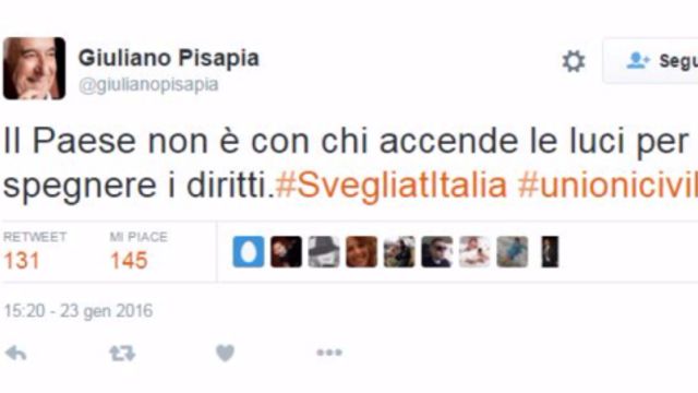 Non si placano le polemiche per la scritta "Family Day" comparsa sul Pirellone a Milano. Il sindaco Giuliano Pisapia è andato all'attacco del governatore Roberto Maroni. "Il Paese non è con chi accende le luci per spegnere i diritti", ha scritto su Twitter. Il primo cittadino ha preso parte al corteo di Milano in favore delle unioni civili.