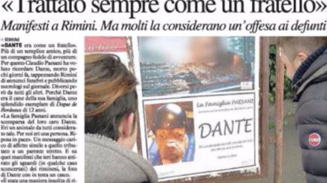 "La famiglia Paesani annuncia la scomparsa del loro caro Dante. Eri un animale da tutti considerato tale. Per noi eri una persona. Riposa in pace". E' la dedica che campeggia sui manifesti funebri fatti fare per la scomparsa dell'amato cane, uno splendido esemplare di Dogue de Bordeaux di 12 anni, e ripresa dal Resto del Carlino . Da qualche giorno Rimini è piena di avvisi, con tanto di foto ricordo, ma non tutti gli abitanti hanno gradito.