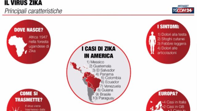 Il virus Zika è parente dei virus della dengue, e si presenta con una sintomatologia simile a quella di dengue e chikungunya, anche se più lieve: febbre, dolori articolari e muscolari, eruzioni cutanee, congiuntivite. Durante la prima settimana di infezione, il virus Zika può essere trovato nel sangue e passa da una persona infetta ad un'altra sana attraverso le punture della zanzara aedes aegypti, "cugina" della zanzara tigre