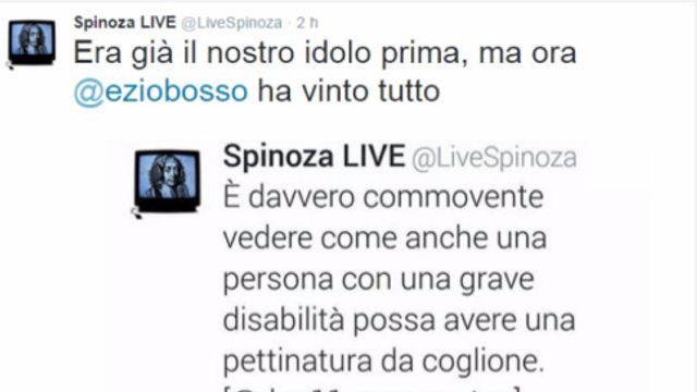Ezio Bosso ha conquistato tutti. Non solo il Festival di Sanremo, ma anche i blogger dall'ironia pungente di "Spinoza.it". Lo ha fatto rispondendo per le rime a un tweet del sito: "E' davvero commovente vedere come anche una persona con una grave disabilità possa avere una pettinatura da coglione", ha cinguettato "Spinoza". "Quello perché cerco di pettinarmi da solo" è la risposta del maestro. Dunque la resa del portale: "Era già il nostro idolo prima, ma ora Ezio Bosso ha vinto tutto". Il botta è risposta è diventato virale in pochissimo tempo.