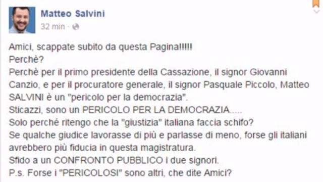 "Amici, scappate subito da questa pagina!!!!! Perché? Perché per il primo presidente della Cassazione, il signor Giovanni Canzio, e per il procuratore generale, il signor Pasquale Ciccolo, Matteo Salvini è un pericolo per la democrazia". Lo scrive su Facebook lo stesso leader della Lega. "Sticazzi, sono un pericolo per la democrazia. Solo perché ritengo che la giustizia italiana faccia schifo? Forse i pericolosi sono altri", aggiunge.