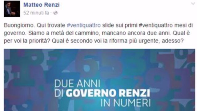 "Il governo è a metà del cammino, mancano ancora due anni. Qual è per voi la priorità? Qual è secondo voi la riforma più urgente, adesso?". Lo scrive su Facebook Matteo Renzi postando le slide di Palazzo Chigi con quanto fatto nei 24 mesi da premier. Oggi ricorrono i due anni dal giuramento del suo governo e il presidente del Consiglio interpella gli utenti del social network per capire quali riforme avvertano come più urgenti.
