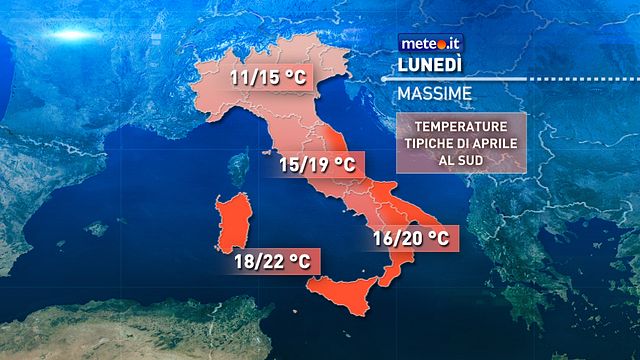 Temperature: massime in ulteriore aumento al Centrosud, in lieve calo al Nordovest. Punte fino a 20 gradi e oltre al Sud e nelle Isole. Previsti nel pomeriggio 15°C a Milano, Bologna e Pisa, 17°C a Ancona, Firenze, Roma e Bari, 20°C a Catania e Palermo, 21°C a Sassari. Al Sud localmente avremo valori tipici del mese di aprile.
