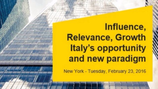 Migliorare il posizionamento delle aziende italiane negli Stati Uniti e attrarre nuovi investimenti. Sono gli ambiziosi obiettivi del summit "Italy meets the United States of America", l'evento organizzato da Italian Business & Investment Initiative in collaborazione con EY in programma per il 23 febbraio a New York. L'edizione 2016 è intitolata "Influence, Relevance and Growth – Italy's new paradigm".