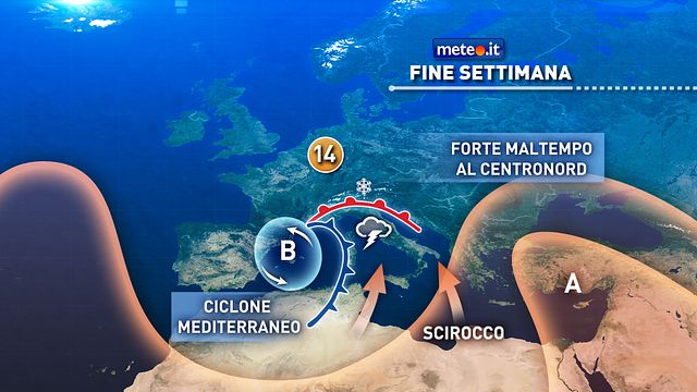 La perturbazione in transito sul nostro Paese, la numero 13 di febbraio, prima di abbandonare la Penisola nella giornata di venerdì porterà ancora locali episodi di instabilità al Centrosud. Le correnti occidentali al seguito di questa perturbazione favoriranno anche un abbassamento delle temperature, con il ritorno su valori più normali per questo periodo in gran parte del Paese. Nella seconda parte del giorno graduale peggioramento del tempo anche al Nordovest per l'avvicinarsi di un'altra più intensa perturbazione (la numero 14 del mese di febbraio), che poi nel corso del fine settimana porterà molte piogge, anche intense e battenti, al Centronord, con fenomeni anche a carattere di temporale su Liguria, regioni tirreniche e Sardegna, abbondanti nevicate sulle Alpi e venti forti.