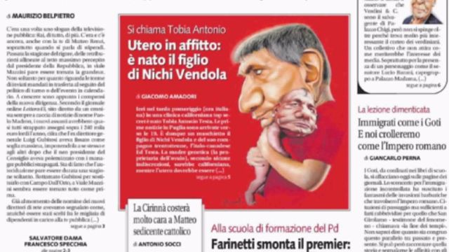 L'attacco del centrodestra - Un lieto evento che però è stato accolto da forti polemiche: mentre è ancora cocente la delusione nel mondo lgbt per l'approvazione in Senato del ddl sulle unioni civili senza stepchil adoption, sono state durissime le critiche del centrodestra per la scelta dell'ex presidente della Regione Puglia e leader di Sel, e del suo compagno canadese di ricorrere all'utero in affitto. Gli attacchi di quella che Vendola aveva definito in una recente intervista una "subalternità culturale della politica", sono stati pressoché simultanei alla notizia della nascita del piccolo, concepito negli Usa da una donna californiana. E se il leader della Lega Nord, Matteo Salvini, parla di "disgustoso egoismo", il senatore di Forza Italia, Maurizio Gasparri, punta il dito contro "questa sinistra che usa il turpe metodo dell'utero in affitto per inventarsi genitori dei figli degli altri".