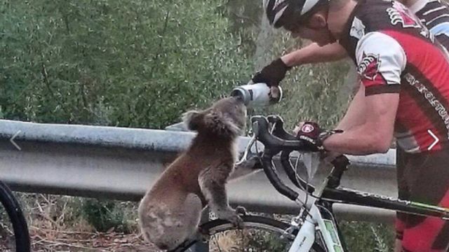 L'ondata di caldo che sta mettendo in difficoltà l'Australia da mesi crea non pochi problemi anche agli animali selvatici. Tanto che quando Nick Lothian, ciclista di Adelaide, si è fermato per bere durante una pedalata con alcuni amici, è stato avvicinato sulla strada da un piccolo koala assetato. Il marsupiale si è avvicinato alla comitiva, si è arrampicato sulla ruota anteriore della bici e si è servito dalla borraccia dell'uomo.