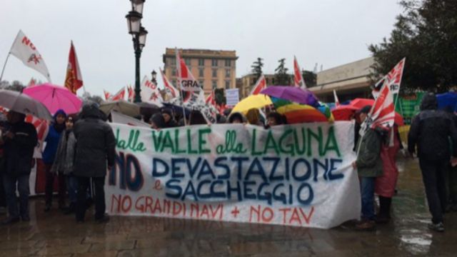 Il capoluogo veneto ha sancito così una sorta di gemellaggio tra i No Tav piemontesi, i sostenitori contro le navi in laguna e chi è contro le trivelle, per ribadire il loro dissenso perché, come scritto in uno dei tanti cartelli: "Il tribunale dei popoli condanna il sistema delle grandi opere inutili ed imposte".