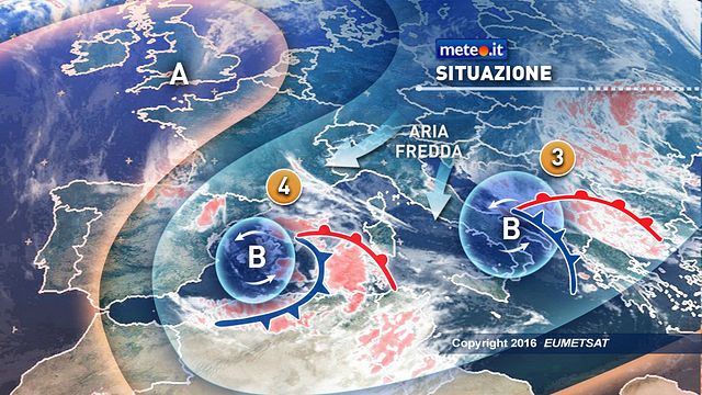 Nel corso dei prossimi giorni il settore centromeridionale del Mediterraneo diverrà sede di una circolazione di bassa pressione che nella sua evoluzione coinvolgerà più direttamente e con maggiore insistenza le regioni del versante adriatico, il Sud e le isole maggiori. Per contro, le regioni settentrionali beneficeranno maggiormente della vicinanza di un'area di alta pressione che si sta consolidando sul Centronord dell'Europa. La prossima settimana esordirà con la presenza di un'area anticiclonica nel Centronord dell'Europa. Per questo motivo l'Italia verrà a trovarsi in un flusso di correnti orientali che, pescando aria gelida proveniente dalla Russia, determineranno temperature sotto le medie stagionali, allungando quindi l'attuale colpo di coda dell'inverno.