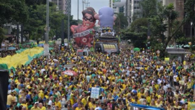 Nuova prova di forza delle opposizioni brasiliane, che hanno portato in piazza quasi due milioni di persone in 300 diverse città e villaggi per protestare contro il governo di sinistra della presidente Dilma Rousseff, ritenuta incapace di gestire la crisi politica ed economica che attanaglia il Paese. La protesta si è estesa anche al predecessore di Dilma, l'ex presidente Lula.