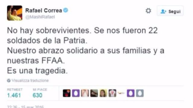 Un aereo militare con 22 persone a bordo si è schiantato nella provincia amazzonica di Pastaza, in Ecuador. Lo rendono noto i media locali, precisando che non ci sono sopravvissuti. Il velivolo apparteneva all'esercito di Quito e a bordo si trovavano 19 paracadutisti, due piloti e un meccanico. A confermare la tragedia è stato via Twitter il presidente dell'Ecuador, Rafael Correa.