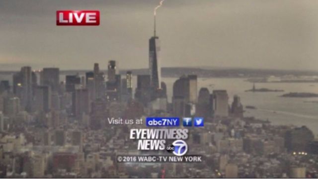 Il Tg chiude col botto. E' quello che è accaduto al collegamento delle 18 del canale ABC7 di New York, dopo i saluti dei conduttori: l'inquadratura si sposta su Manhattan ed è in quel momento che un fulmine colpisce in pieno lo One World Trade Center, il quarto grattacielo più alto al mondo, conosciuto anche come la Freedom Tower sorta sulle ceneri delle Torri Gemelle, distrutte negli attentati dell'11 settembre 2001.