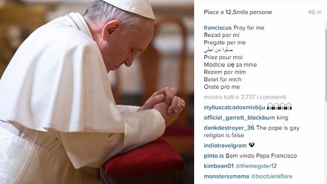 Bergoglio sempre più social: è stato inaugurato l'account Instagram di Papa Francesco, raggiungibile con "@Franciscus". La prima foto postata ritrae il Pontefice inginocchiato in preghiera e quando è uscita i follower erano circa dodicimila. "Inizia un nuovo cammino, in Instagram, per percorrere con voi la via della misericordia e della tenerezza di Dio": questo il tweet sull'account del Papa, che annuncia lo sbarco sull'altro social