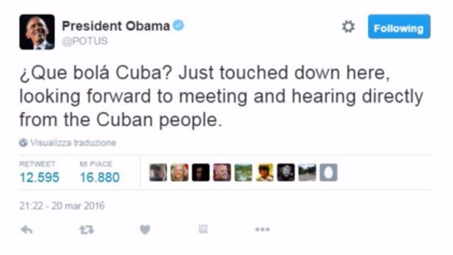 "Que bola Cuba? (Come va Cuba?, ndr). Sono appena arrivato alla meta qui, non vedo l'ora di incontrare e sentire direttamente il popolo cubano". Lo ha twittato al suo arrivo a L'Avana il presidente Usa Barack Obama, che ha definito la visita "un'opportunità storica". "E' meraviglioso essere qui", ha poi affermato incontrando lo staff dell'ambasciata americana a Cuba.