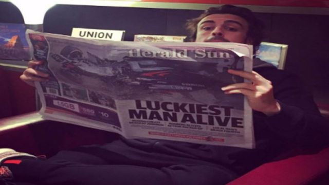 Il giorno dopo il terribile incidente di Melbourne, Fernando Alonso trova anche la forza di scherzarci su postando una foto sui social. Lo spagnolo, uscito dal proprio abitacolo praticamente illeso dopo aver tamponato la Haas di Gutierrez ed essere "decollato", ha pubblicato infatti su Instagram una foto che lo ritrae intento a leggere un giornale australiano dal titolo eloquente ("L'uomo più fortunato, sopravvissuto"), aggiungendo un commento ironico: "Credo che si riferiscano a me".