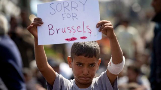 Un cartello con un scritta per metà nera e per metà rossa: "Sorry for Brussels". Anche dal campo di Idomeni, al confine tra Grecia e Macedonia, giunge il cordoglio per quanto accaduto in Belgio, dove diverse esplosioni hanno causato morti e feriti. Un messaggio che assume ancora più valore se si pensa al dramma che questo bambino, i suoi amici e la sua famiglia vivono da tempo. Proprio martedì, 2 migranti si sono dati fuoco per protestare contro la chiusura della rotta balcanica.