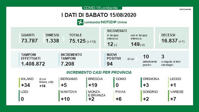 Sono 94 i nuovi casi di coronavirus in Lombardia nelle ultime 24 ore. Lo riporta il bollettino del 15 agosto della Regione, secondo cui 10 sono debolmente positivi e 3 sono stati tracciati a seguito di test sierologici. C'è anche una vittima. I tamponi effettuati sono 7.028 per un totale complessivo di 1.408.872. I ricoverati in terapia intensiva rimangono stabili a 12 e i pazienti in ospedale scendono di 4 unità, arrivando a 149.