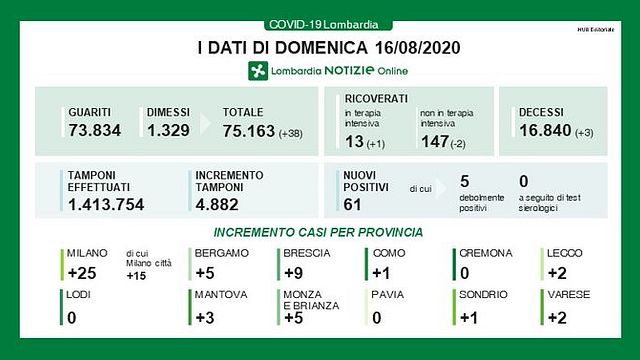 Sono 61 i nuovi casi di coronavirus in Lombardia, di cui 5 debolmente positivi e nessuno a seguito di test sierologico. I tamponi effettuati sono 4.882. Tre decessi portano a 16.840 il totale complessivo delle vittime dall'inizio della pandemia. Aumentano guariti e dimessi (+38). Salgono a 13 le persone ricoverate in terapia intensiva (+1), mentre scendono a 147 quelle non in terapia intensiva (-2).