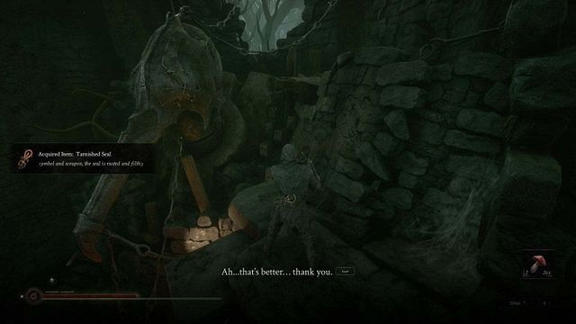 Dall'interno della torre, al piano terra, strisciate attraverso l'uscita bassa (a sinistra rispetto alla Sorella). Vi troverete nei pressi di un grosso albero, dove si aggirano un predone e un nemico con l'ascia. Lasciatevi cadere verso il percorso più in basso, per atterrare vicino a una torcia e a una roccia con iscrizione.