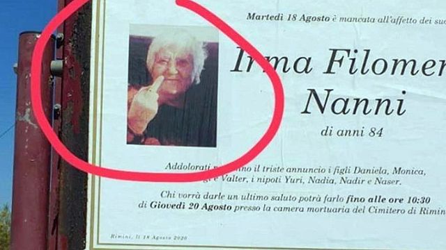 Si dice che nessuno muoia davvero finché vive nella memoria di chi resta in vita. Di sicuro gli abitanti di Sapadarolo, in provincia di Rimini, non dimenticheranno facilmente Irma Filomena Nanni, 84enne scomparsa il 18 agosto scorso. Il motivo è da ricercare nel manifesto funebre della donna: sulla fotografia, scelta dai familiari, Irma è ritratta mentre mostra sorridente il dito medio alzato. L'immagine è stata resa pubblica dalla pagina Facebook "I Matti di Rimini", generando migliaia di like e centinaia di commenti di stima.