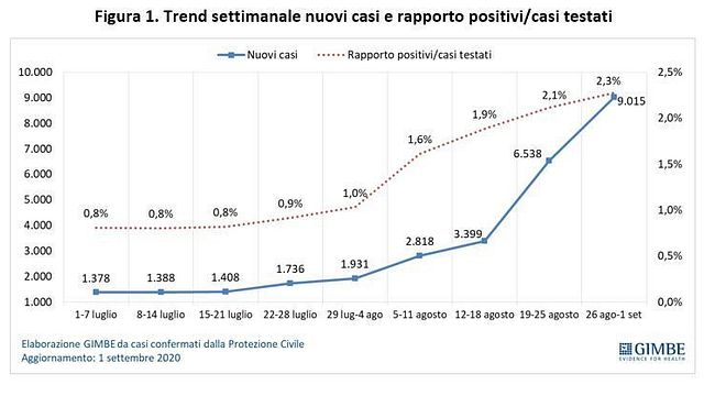 Fondazione Gimbe: "Dato sulle terapie intensive in rialzo del 62%" Il monitoraggio indipendente della Fondazione Gimbe registra nella settimana 26 agosto-1 settembre, rispetto alla precedente, un incremento del 37,9% dei nuovi casi (9.015 vs 6.538) e del 52,2% dei casi attualmente positivi (7.040 vs 4.625). Aumentano anche i pazienti ricoverati con sintomi (1.380 vs 1.058) e quelli in terapia intensiva (107 vs 66). Lieve incremento dei decessi (46 vs 40). In dettaglio, rispetto alla settimana precedente, si registrano le seguenti variazioni: decessi: +6 (+15%); terapia intensiva: +41 (+62,1%); ricoverati con sintomi: +322 (+30,4%); nuovi casi: 9.015 (+37,9%); casi attualmente positivi: +7.040 (+ 52,2%); casi testati +86.515 (+28%); tamponi totali: +116.184 (+24%).