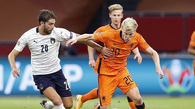 Nella seconda giornata della Lega A di Nations League, l'Italia batte 1-0 l'Olanda, conquista la prima vittoria post-lockdown e balza in vetta al gruppo 1. Ad Amsterdam, fantastico primo tempo degli azzurri, che mettono sotto i padroni di casa e trovano il gol-vittoria nel recupero, grazie a un colpo di testa di Barella servito da Immobile (46'). Nella ripresa Donnarumma è super su Van de Beek, Kean si divora il raddoppio al 91'.