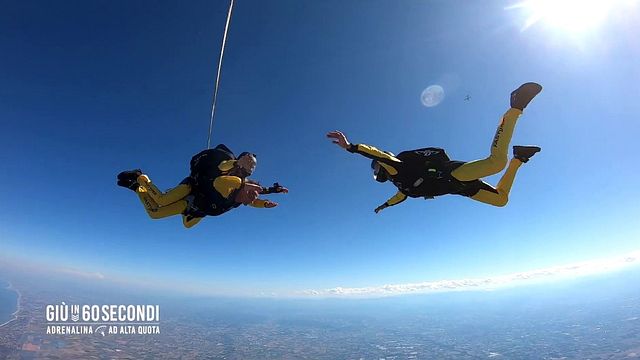 Qui i protagonisti faranno una prima immersione nelle sensazioni forti del volo e studieranno la posizione da tenere durante il salto. Il giorno successivo, al campo volo Skydive Pullout di Ravenna, il briefing, la salita in aereo e il salto: un minuto di adrenalina pura, 60 secondi a 200 km/h prima di aprire la vela e planare dolcemente nella zona di atterraggio. "Giù in 60 secondi" racconta il percorso emozionale dei vip, tra l’esaltazione, la paura e la soddisfazione del salto. Le sensazioni forti che i personaggi vivono durante il programma, li portano a svelare un’immagine di sé autentica e poco conosciuta al pubblico.