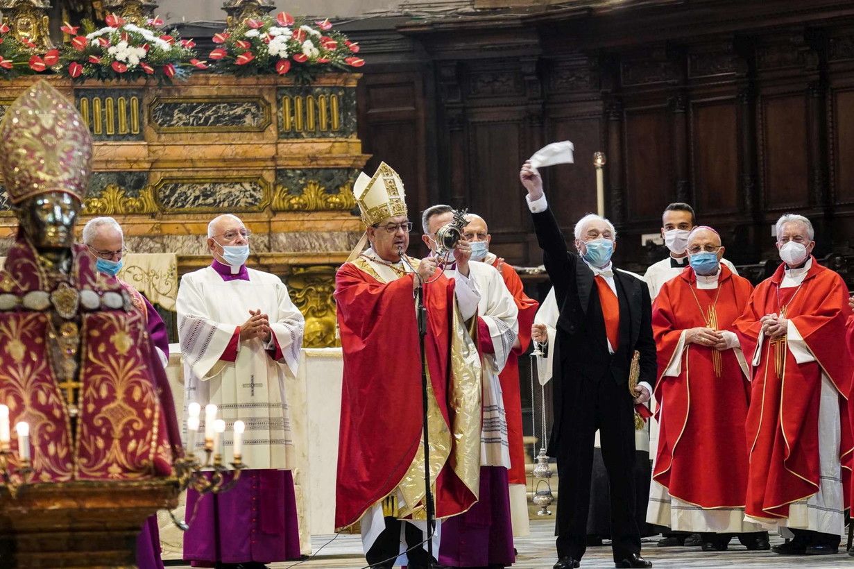 Si è ripetuto a Napoli il prodigio del "miracolo" di San Gennaro. L'annuncio della liquefazione del sangue è stato dato alle 10.02 in un Duomo vuoto per la festa del santo, per le misure anti Covid-19. Il sangue era già sciolto nel momento in cui l'ampolla è stata presa dalla teca. "Con gioia e commozione - ha detto il cardinale Crescenzio Sepe - il sangue del nostro santo patrono è sciolto". Il compimento del rito è considerato di buon auspicio per Napoli e tutta la Campania.
