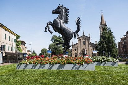 Nel Modenese - Per gli appassionati delle “rosse di Maranello”, fotografia obbligata al Cavallino Rampante alto tre metri e alla firma gigante di Enzo Ferrari che si possono vedere in centro a Maranello. Il primo, modellato in lamiera battuta, è uno dei luoghi più cari ai maranellesi e agli appassionati della Ferrari e svetta nella rotonda all’incrocio tra via Claudia e via Giardini.