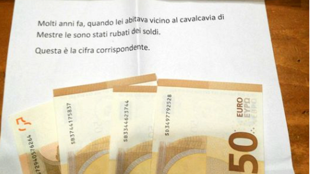 Sorpresa dopo 40 anni - L'ex sindacalista della Cgil ha perdonato il ladro che gli aveva rubato l'intero stipendio alla fine degli anni Settanta. Al rientro a casa Di Cataldo ha trovato una gradita sorpresa: 200 euro - l'equivalente attuale del salario di allora, 400mila lire - e un biglietto con su scritto: "Molti anni fa, quando Lei abitava vicino al cavalcavia di Mestre, Le sono stati rubati dei soldi. Questa è la cifra corrispondente"
