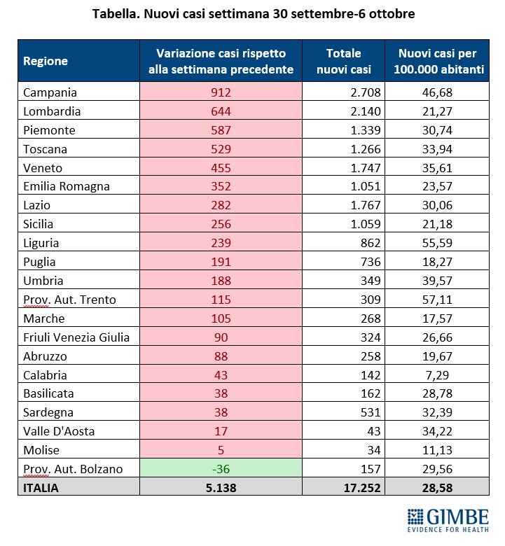 La curva dei contagi da coronavirus in Italia sta crescendo con un ritmo decisamente sostenuto. E' quanto rivela il monitoraggio della Fondazione Gimbe: nella settimana 30 settembre-6 ottobre, rispetto alla precedente, è stato infatti registrato un netto incremento nel trend dei nuovi casi (17.252 vs 12.114) pari a un aumento del 42,4%.