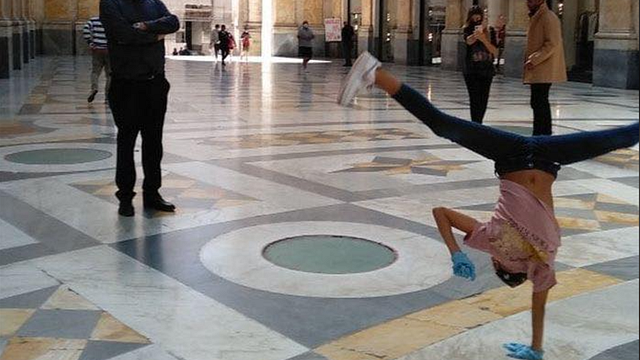 Danza in mascherina - Ogni pomeriggio, dopo la scuola, Miriam, 8 anni, si esibisce volteggiando sui marmi della Galleria - davanti a passanti e turisti che ammirano rapiti le sue piroette e le sue "ruote" - indossando la mascherina e i guanti per evitare il contagio. "Prima lavavo le mani e basta ma ora ho paura del coronavirus", ha raccontato la giovanissima ballerina che ha scoperto di amare il ballo tre anni fa (quando ne aveva appena cinque), dopo la visione della serie tv "Cercami a Parigi".