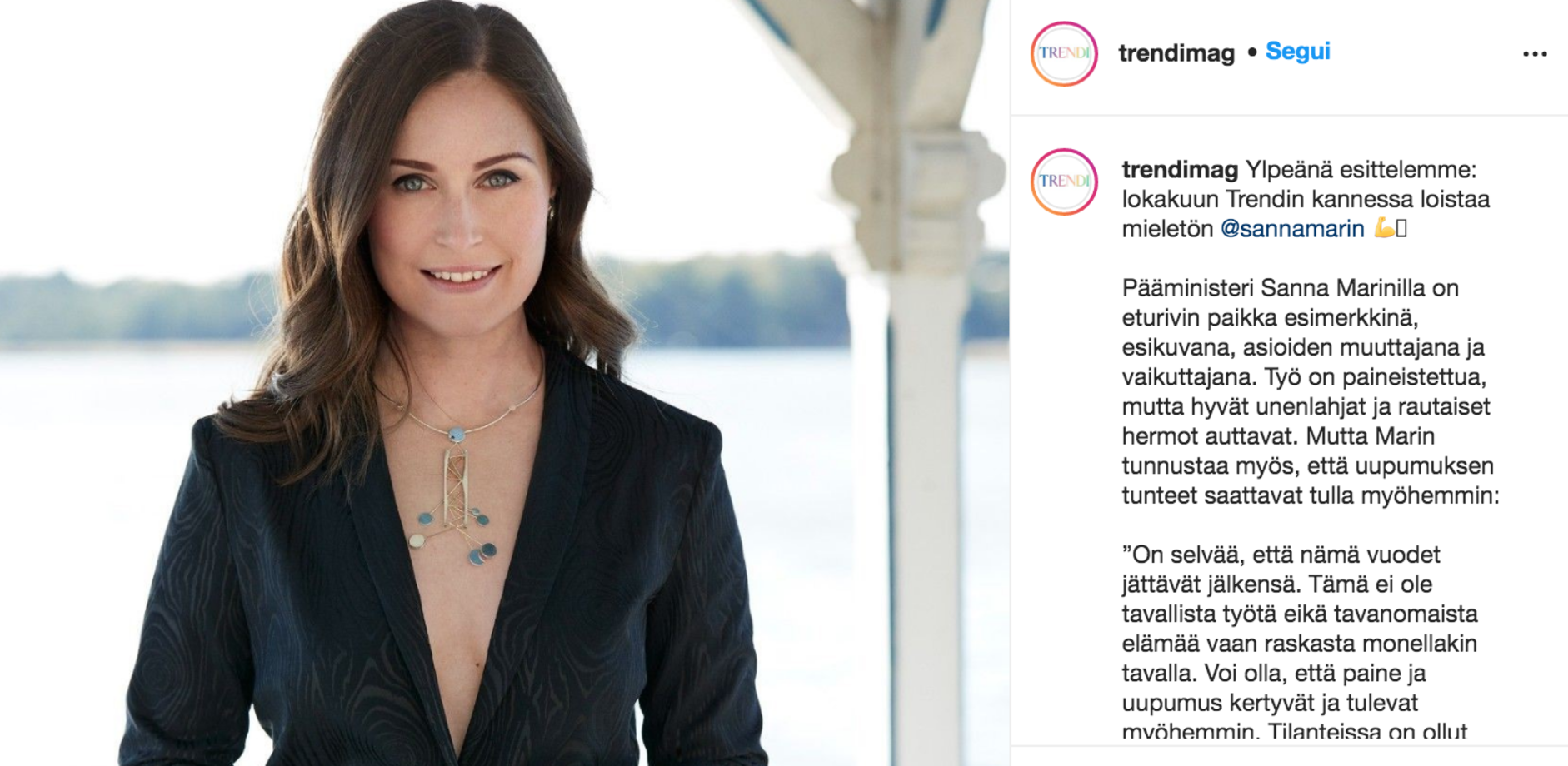 "#Imwithsanna". E' l'hashtag utilizzato dai finlandesi per una campagna social in difesa della loro premier 34enne Sanna Marin. Tutto è partito da un servizio fotografico del popolare magazine femminile locale Trendi, per il quale Marin ha posato con un abito scollato. Una scelta che ha scatenato le polemiche: "indecente", "inappropriato", "perché non pensa a governare invece di fare la modella", "c’è il Covid e lei si spoglia" sono alcune delle critiche che le sono state rivolte. A difenderla ci hanno pensato centinaia di finlandesi, donne e uomini, che hanno popolato le bacheche social con foto di scollature accompagnate dall’hashtag "io sto con Sanna".
