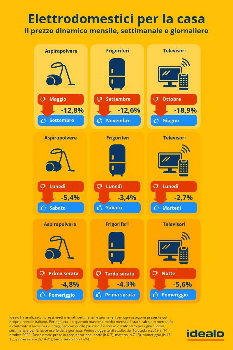Gli elettrodomestici per la casa: attenzione ai prezzi del lunedì - Idealo ha preso in esame tre categorie di elettrodomestici per la casa e per ognuna ha identificato mese, giorno e fascia oraria in media più convenienti per effettuare l’acquisto online. Il giorno con i prezzi medi più alti per effettuare gli acquisti è comune a tutti: il lunedì.
