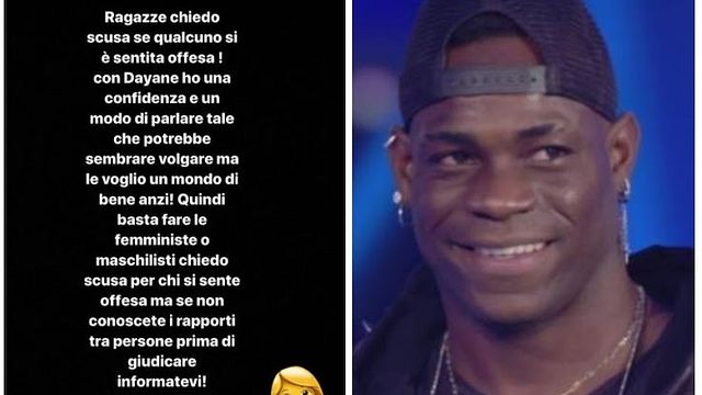 “Ragazze chiedo scusa se qualcuno si è sentita offesa! Con Dayane ho una confidenza e un modo di parlare tale che potrebbe sembrare volgare ma le voglio un mondo di bene, anzi! Quindi basta fare le femministe o i maschilisti, chiedo scusa per chi si sente offesa ma se non conoscete i rapporti tra persone prima di giudicare informatevi! Ho due mamme, tre sorelle e una figlia, le donne sono la mia vita. Basta speculare sull’ignoto. Vi voglio bene” è il messaggio pubblicato su Instagram da Balotelli subito dopo la trasmissione.