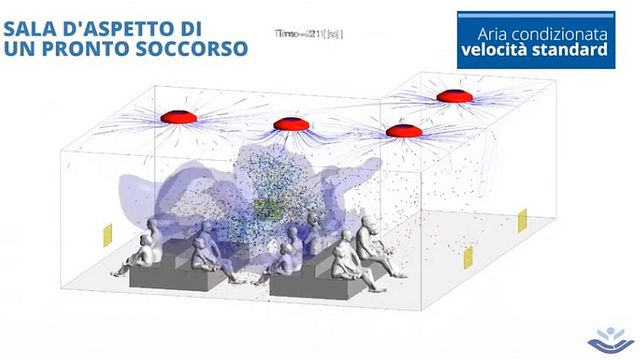 I risultati - I risultati dello studio confermano che i sistemi di condizionamento dell’aria svolgono un ruolo determinante nel controllo della dispersione di droplet e aerosol prodotti col respiro negli ambienti chiusi. Per la prima volta è stato documentato, infatti, che il raddoppio della portata dell’aria condizionata (calcolata in metri cubi orari) all’interno di una stanza chiusa riduce la concentrazione delle particelle contaminate del 99,6%. Al tempo stesso, la velocità doppia causa una dispersione aerea di droplet e aerosol più rapida e a distanze più grandi rispetto all’aria condizionata con portata standard oppure spenta: a condizionatore spento le persone più vicine al bambino che tossisce (1,76 metri nella simulazione) respirano l’11% di aria contaminata mentre i più lontani (4 metri) non vengono raggiunti dalla “nube” infetta. Con il sistema a velocità doppia si abbatte la concentrazione di contaminante e le persone più vicine ne respirano lo 0,3%, ma vengono raggiunte rapidamente anche quelle più lontane che in questo caso respirano lo 0,08% di aerosol contaminato, percentuali bassissime e sostanzialmente irrilevanti ai fini del contagio.