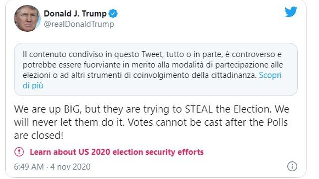 Twitter ha segnalato il tweet di Donald Trump nel quale il presidente ha accusato i democratici: "stanno cercando di rubarci le elezioni - ha scritto- Non lo consentiremo". Non è la prima volta che il social network "zittisce" il presidente per i suoi post ritenuti non in linea con le regole fissate proprio per queste presidenziali che miravano ad arginare il fenomeno delle fake news.