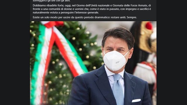 "Le differenti opinioni e la diversità di vedute non devono minare il nostro costante sforzo di sorreggerci gli uni con gli altri. Dobbiamo ribadirlo forte, oggi, nel Giorno dell'Unità nazionale e Giornata delle Forze Armate. Esiste un solo modo per uscire da questo periodo drammatico: restare uniti. Sempre". Lo scrive il premier Giuseppe Conte su Facebook in occasione della ricorrenza del 4 novembre.