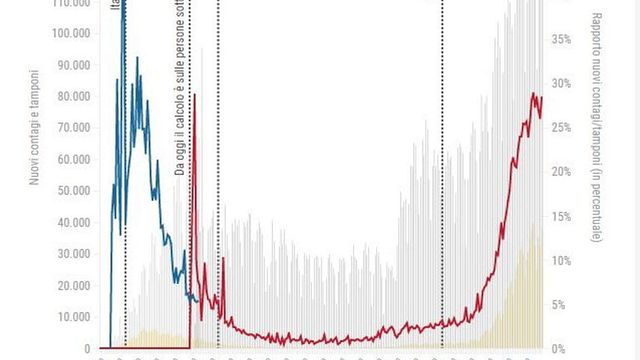 Torna a salire al 28,45%, dopo cinque giorni di trend in calo, il rapporto tra persone sottoposte a tampone (133.478) e positivi al Covid-19 (37.978). Nella giornata di mercoledì l'incidenza si era attestata al 26,07%, mentre il picco (28,92%) si è registrato sabato 7 novembre. Nelle ultime 24 ore ci sono stati anche 15.645 guariti su oltre 100mila tamponi di controllo eseguiti (101.194). In totale i tamponi effettuati da ieri sono stati 234.672.