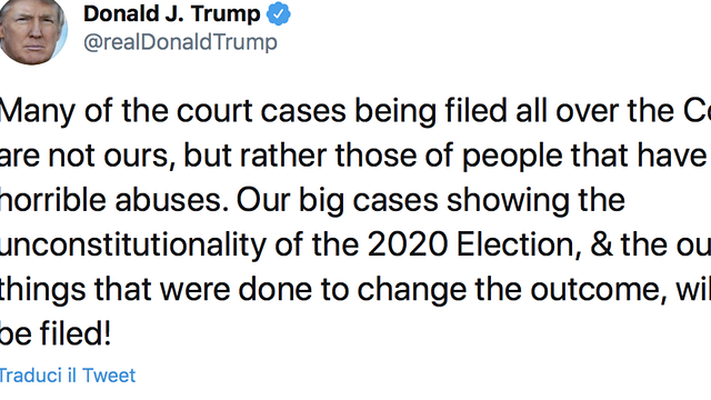 "Le nostre grandi cause, che mostreranno l'incostituzionalità delle elezioni del 2020 e lo scandalo delle cose che sono state fatte per cambiare il risultato, saranno presto depositate". Così il presidente americano Donald Trump su Twitter, spiegando: "Molti dei casi giudiziari in corso in tutto il Paese non sono nostri, ma di persone che hanno segnalato orribili abusi".