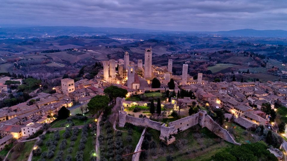 San Gimignano, una delle cittadine in cui più suggestive sono le tracce del medioevo italiano, svetta da lontano sulla cima di un colle che domina la Valdelsa, col suo magico scenario di alte torri svettanti contro il cielo, nell’inconfondibile quiete toscana. Per le sue bellezze naturali e culturali, è annoverato dall’Unesco tra i patrimoni mondiali dell’umanità. Visitarlo è fare un balzo indietro nel tempo, fino all’eroico periodo dell’Italia dei Comuni.
