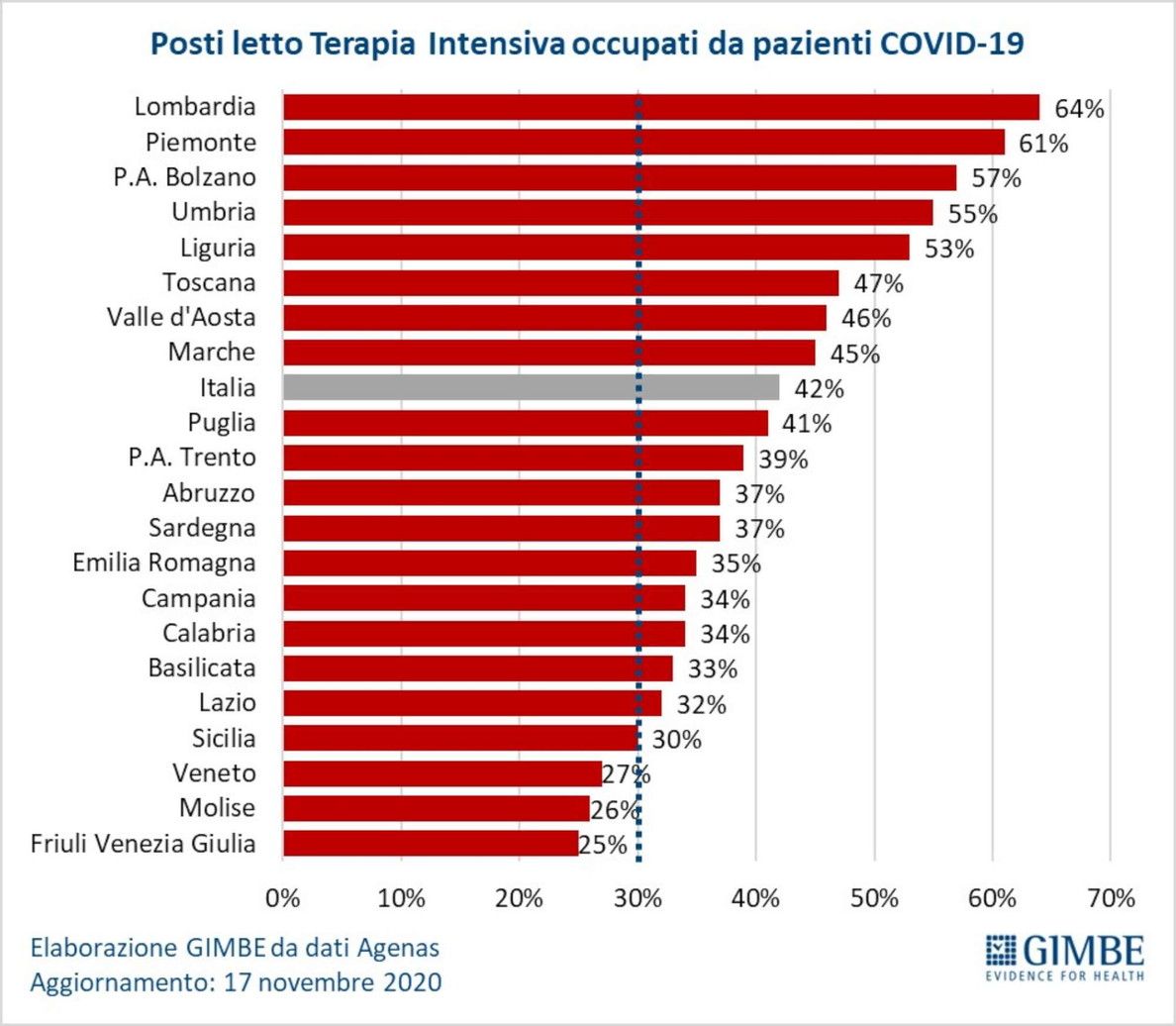 Crescono i pazienti colpiti dal coronavirus e ricoverati nelle terapie intensive. Secondo il monitoraggio della Fondazione Gimbe, la soglia di saturazione è già stata superata in 17 Regioni nella settimana 11-17 novembre. Superata in 15 Regioni anche la soglia di saturazione per i reparti Covid occupati da pazienti con sintomi. I dati mostrano invece una riduzione dell`incremento dei casi positivi. Sono oltre quattromila i decessi nella stessa settimana.