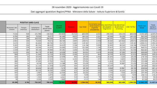 In Abruzzo 77 in terapia intensiva, mai così tanti - Diversi i numeri dell'Abruzzo. Sono 77 i pazienti ricoverati in rianimazione. Non erano mai stati così tanti. Fino ad oggi il record risaliva allo scorso 3 aprile, giorno peggiore dell'emergenza primaverile, quando i pazienti in rianimazione erano 76. Solo lo scorso 20 novembre si è arrivati a sfiorare quel valore, con 75 unità. Con i dati odierni, nonostante un calo complessivo del numero dei ricoveri, che passano da 763 a 757 (-6), le terapie intensive salgono dalle 74 di venerdì alle 77 di sabato. In particolare, gli attualmente positivi sono 201 in più e arrivano a quota 17.762: 680 pazienti (-9 rispetto a ieri) sono ricoverati in terapia non intensiva e 77 (+3) in terapia intensiva.