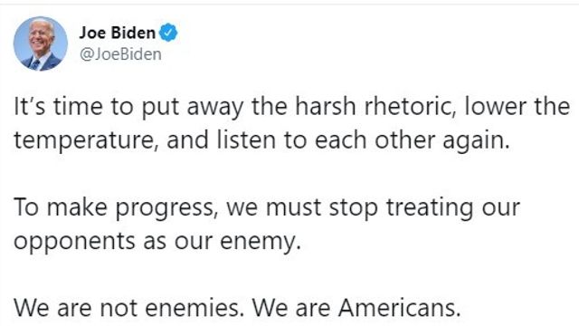 "E' ora di mettere da parte la dura retorica, abbassare i toni e ascoltarci di nuovo. Per fare progressi, dobbiamo smetterla di trattare i nostri avversari come nostri nemici. Non siamo nemici. Siamo americani". Lo scrive su Twitter il presidente eletto degli Stati Uniti Joe Biden dopo l'intervista di Donald Trump che ha di nuovo parlato di brogli nelle elezioni presidenziali.