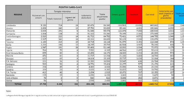 Tornano a salire gli attualmente positivi Secondo il bollettino giornaliero, ci sono in Italia 686.031 attualmente positivi, 1.183 più di sabato, un aumento che si registra dopo giorni di calo. L'incremento dei guariti nelle ultime 24 ore è invece di 16.270 per un totale dall'inizio dell'emergenza di 1.093.161.