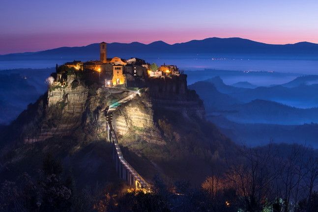 CIVITA DI BAGNOREGIO, Viterbo - Il villaggio è arroccato sulla sommità di una collina nella valle dei calanchi, un'area situata tra il lago di Bolsena e la valle del Tevere, e fa parte del circuito "I borghi più belli d'Italia". Per la sua posizione suggestiva e il suo impianto medievale è meta di numerosi turisti ed è stato più volte utilizzato come set cinematografico. Si raggiunge solo a piedi, lungo una passerella panoramica a gradini.