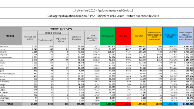 In Italia ci sono 12.030 nuovi casi di coronavirus a fronte di 103.584 tamponi effettuati (mentre il giorno precedente l'incremento era stato di 17.938 su 152.697 tamponi). Nelle ultime 24 ore sono stati registrati altri 491 decessi (contro i 484 di domenica) per un totale, da inizio emergenza, che sale a 65.011. In terapia intensiva sono ricoverati 3.095 pazienti (-63). La Regione più colpita è il Veneto con 2.829 nuovi casi.